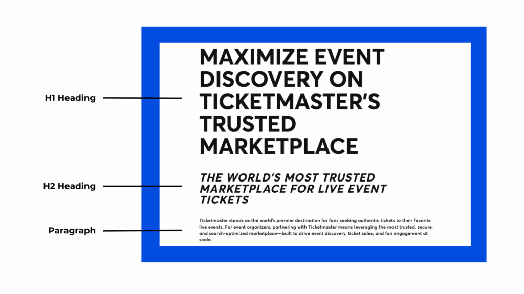 • Page Title: Keep it under 60 characters and include your primary keyword, event name, and location. For example, “Kit Smith at The Ballroom: Official Tickets.”